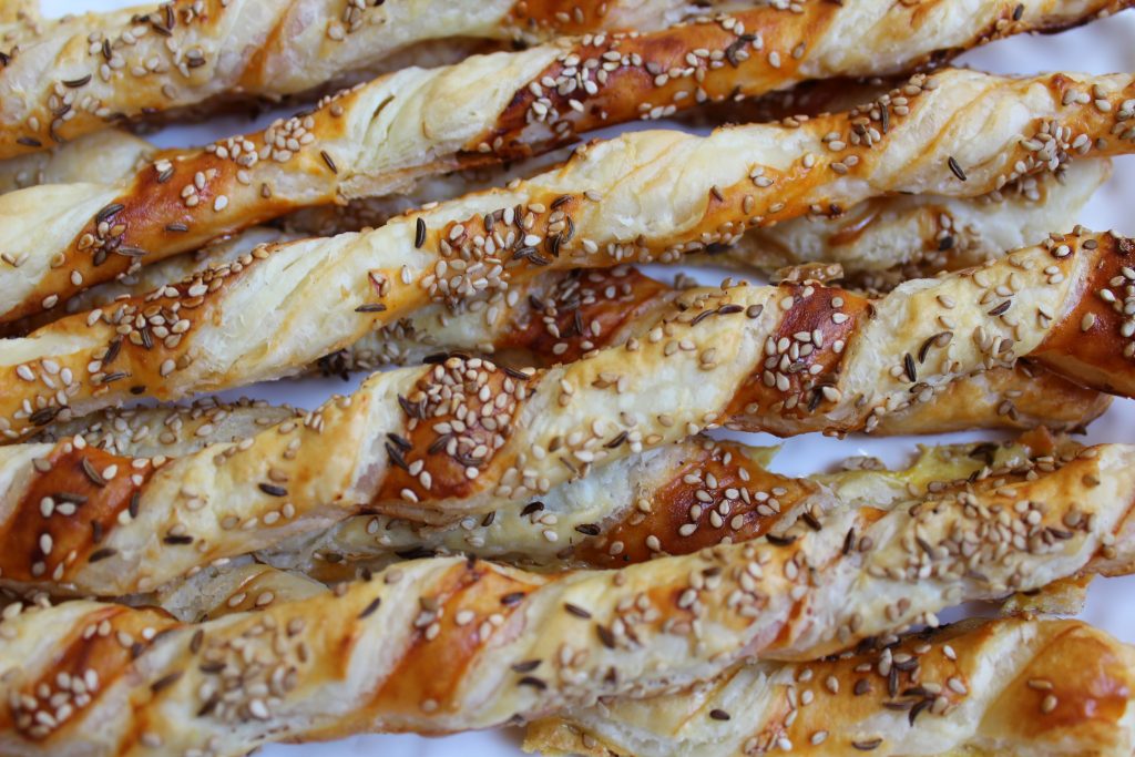 6. Bestreue den Blätterteig mit der Hälfte des Sesams und des Kümmels.