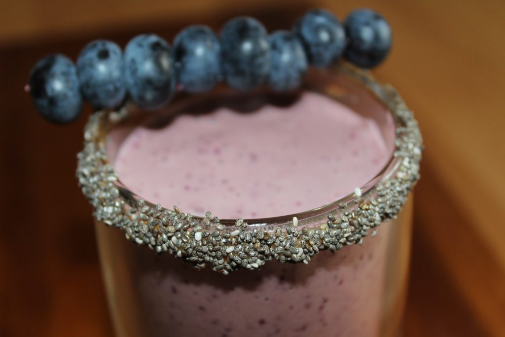 - Glasrand mit Erdnussbutter bestreichen und mit Chiasamen belegen.