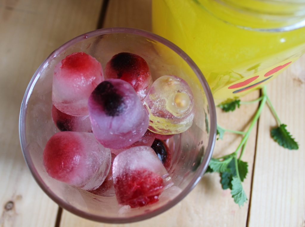 Verfeinern Verschönere die Ingwer-Kurkuma Limonade mit selbstgemachtem Beeren-Würfeleis. Dazu stelle ich in einen leeren Eiswürfelbehälter je ein Stück beliebiger Beeren und fülle diesen mit Wasser auf. Nach circa drei Stunden im Tiefkühlfach sind die Zaubereiswürfel fertig. Sie sind besonders bei den kleinen Genießern unter uns sehr beliebt.