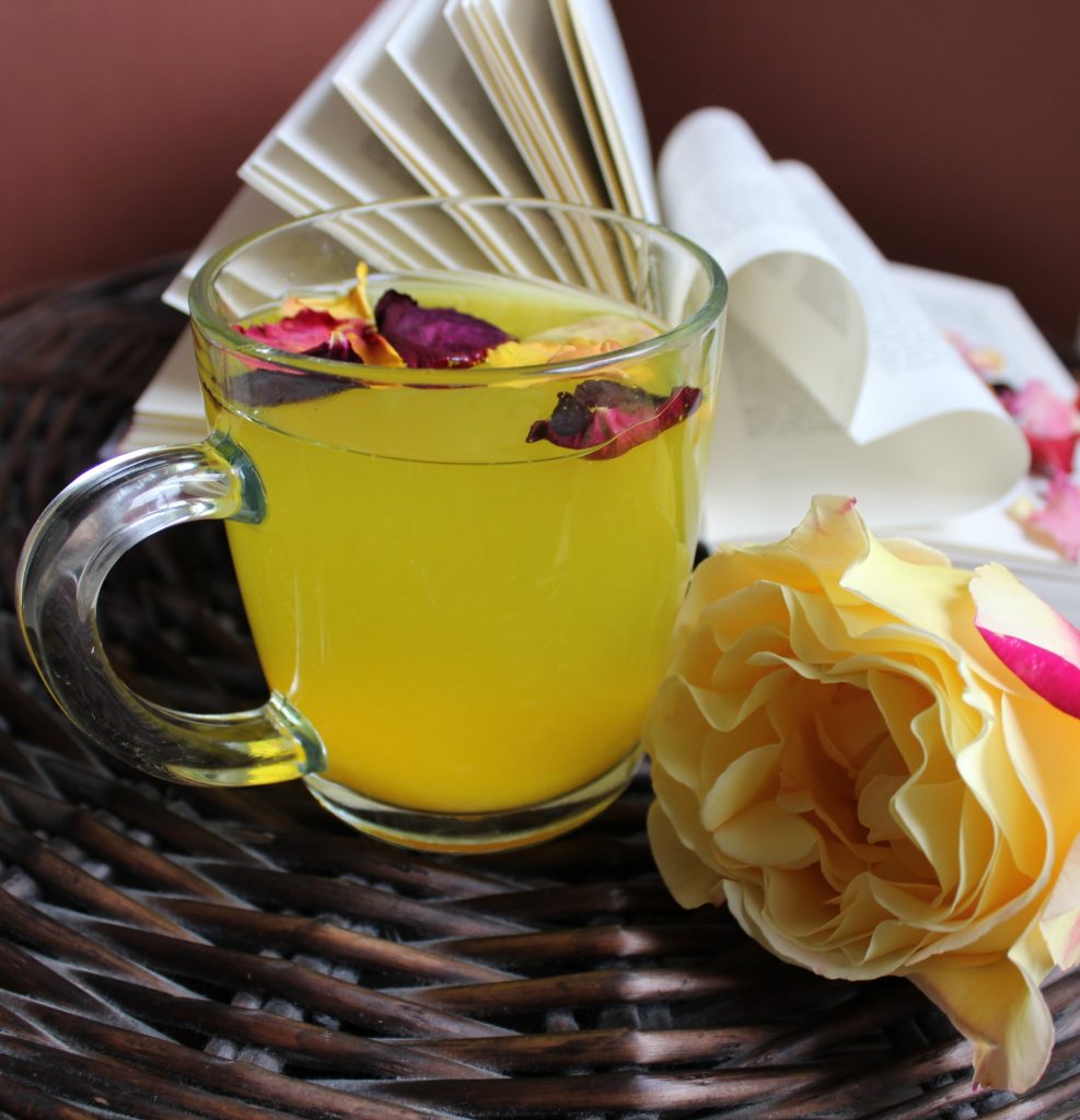Den Ingwer-Kurkuma Tee bereitest Du aus einem Teelöffel der Ingwer-Kurkuma Paste, heißem Wasser und beliebig viel Honig zu. Verfeinert mit Rosenblütenblättern schmeckt und sieht der Tee noch besser aus. Vor jedem Schluck kurz umrühren, damit Du den wertvollen Fruchtfleisch mittrinkst. Anderenfalls setzt sich das Fruchtfleisch am Boden ab und wird am Ende meistens nicht vollständig ausgetrunken.